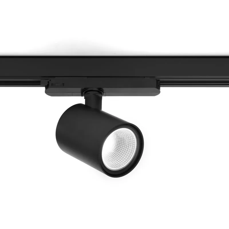 Three-phase electrified track spotlight, adjustable on two axes, complete with high-efficiency LED light source with Chip On Board technology. The fixture is made of epoxy polyester powder-coated aluminium stabilised against UV rays, equipped with an aluminium reflector (36°) with protective screen and three-phase electrical adapter with integrated driver. Reflectors with 24° and 45° beams are available on request. The degree of protection against the penetration of dust, solid bodies and liquids is IP40.